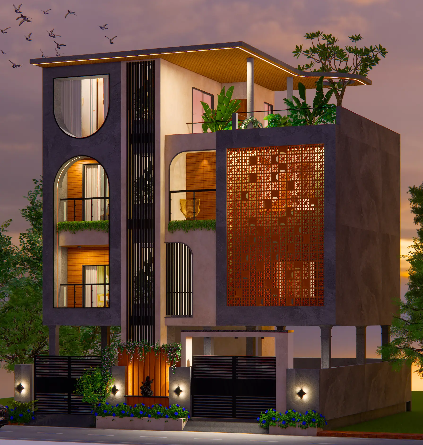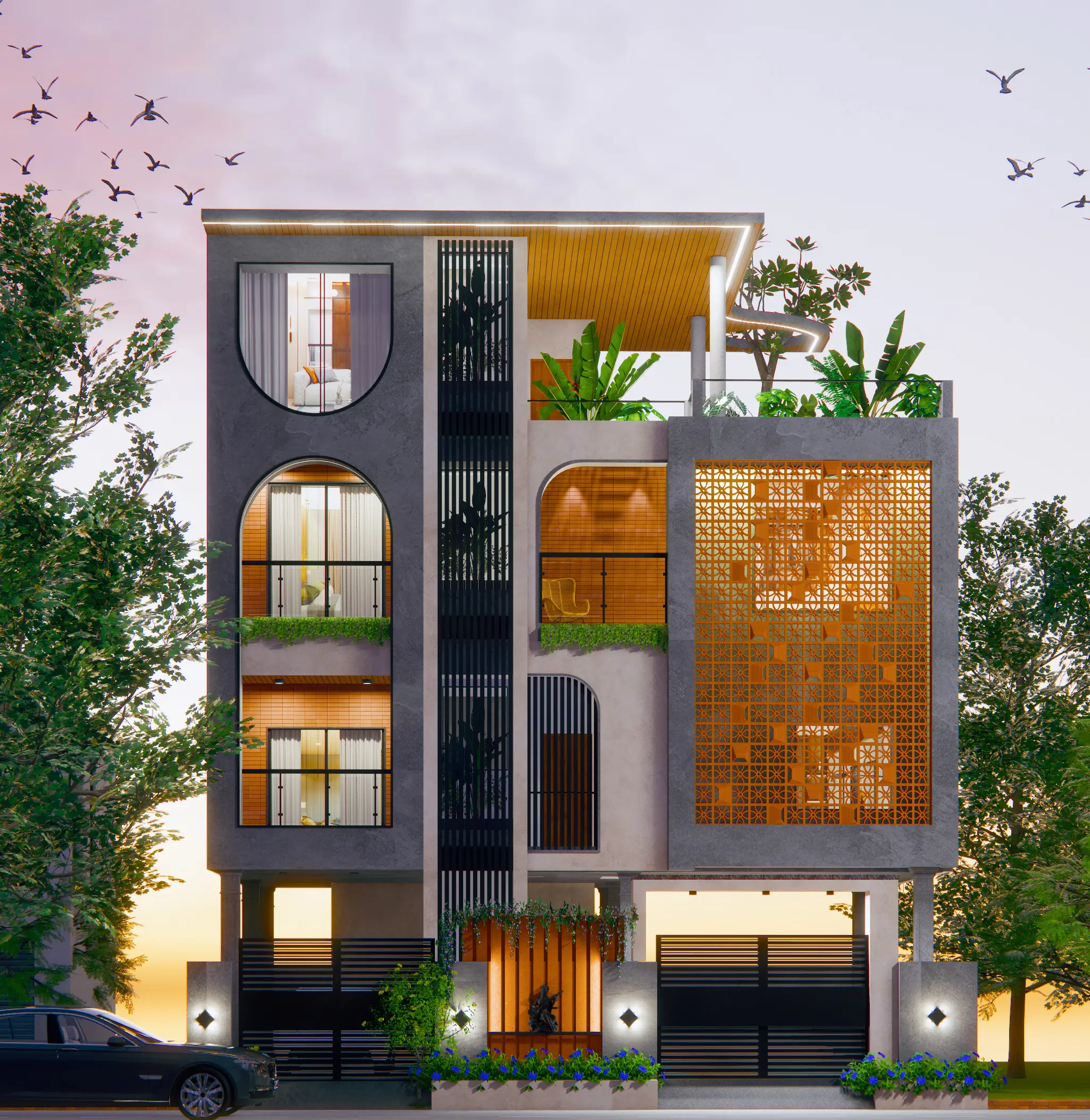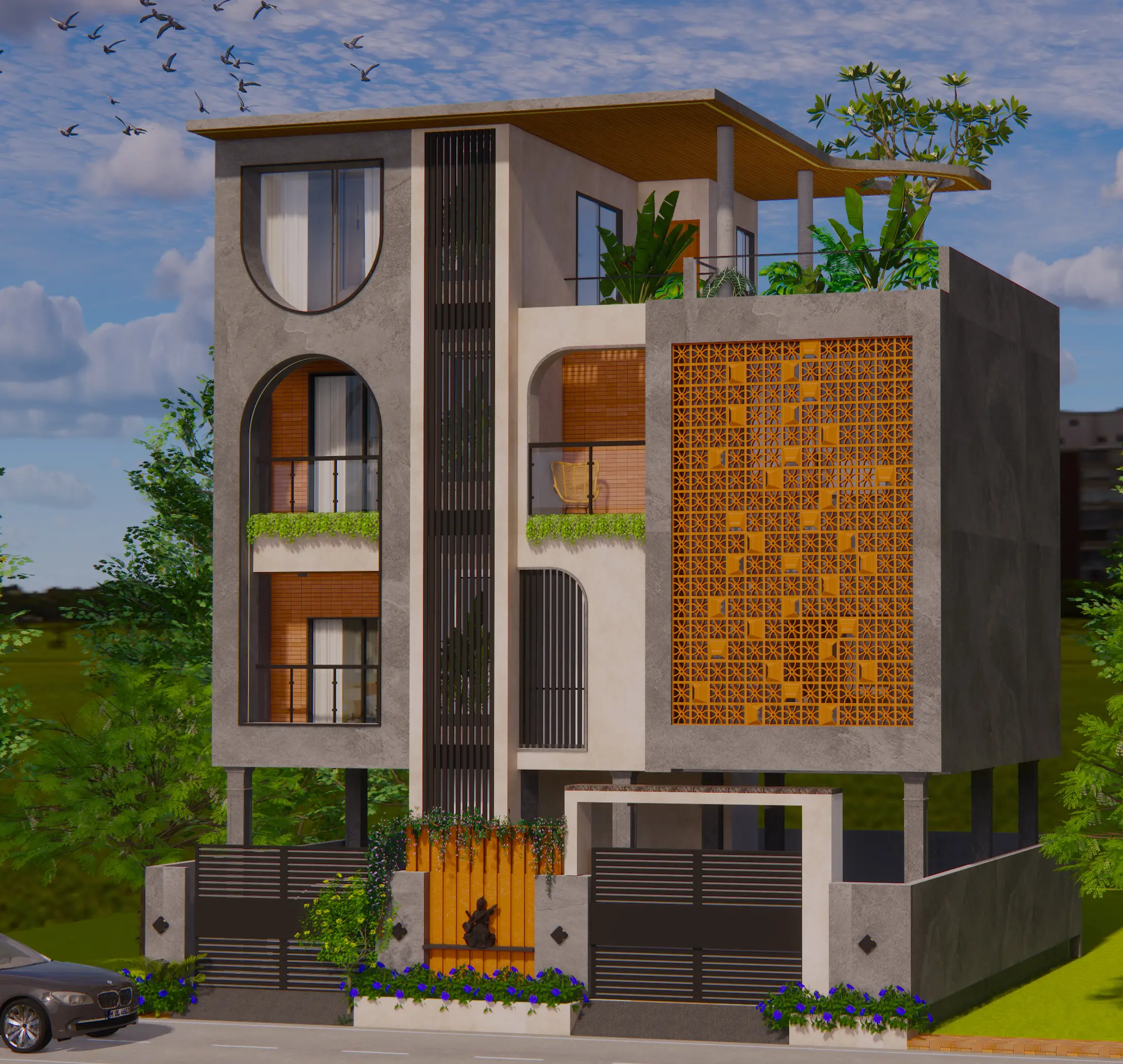 This south-facing bungalow has been thoughtfully designed for a family of six, including five adults and a young child. The design combines functionality and aesthetic appeal, addressing the challenges of direct sunlight with a terracotta double wall. Not only does this feature shield the kitchen and master bedroom from harsh ghting, but it also enhances thermal comfort with its natural heat-reducing properties. The retired patriarch of the family, a former government officer, treasures daily nteractions with neighbors. His room opens onto a charming balcony overlooking the main road, providing the perfect spot for warm greetings and casual conversations, fostering a sense of community. On the terrace, a striking canopy extends over the multipurpose room, creating a semi-covered space ideal for both personal and social activities. The canopy adds a dramatic visual element to the design while ensuring the space remains practical and comfortable for year-round use. This bungalow is a testament to thoughtful architecture, balancing modern needs with timeless warmth and elegance, making it a perfect sanctuary for a vibrant family.